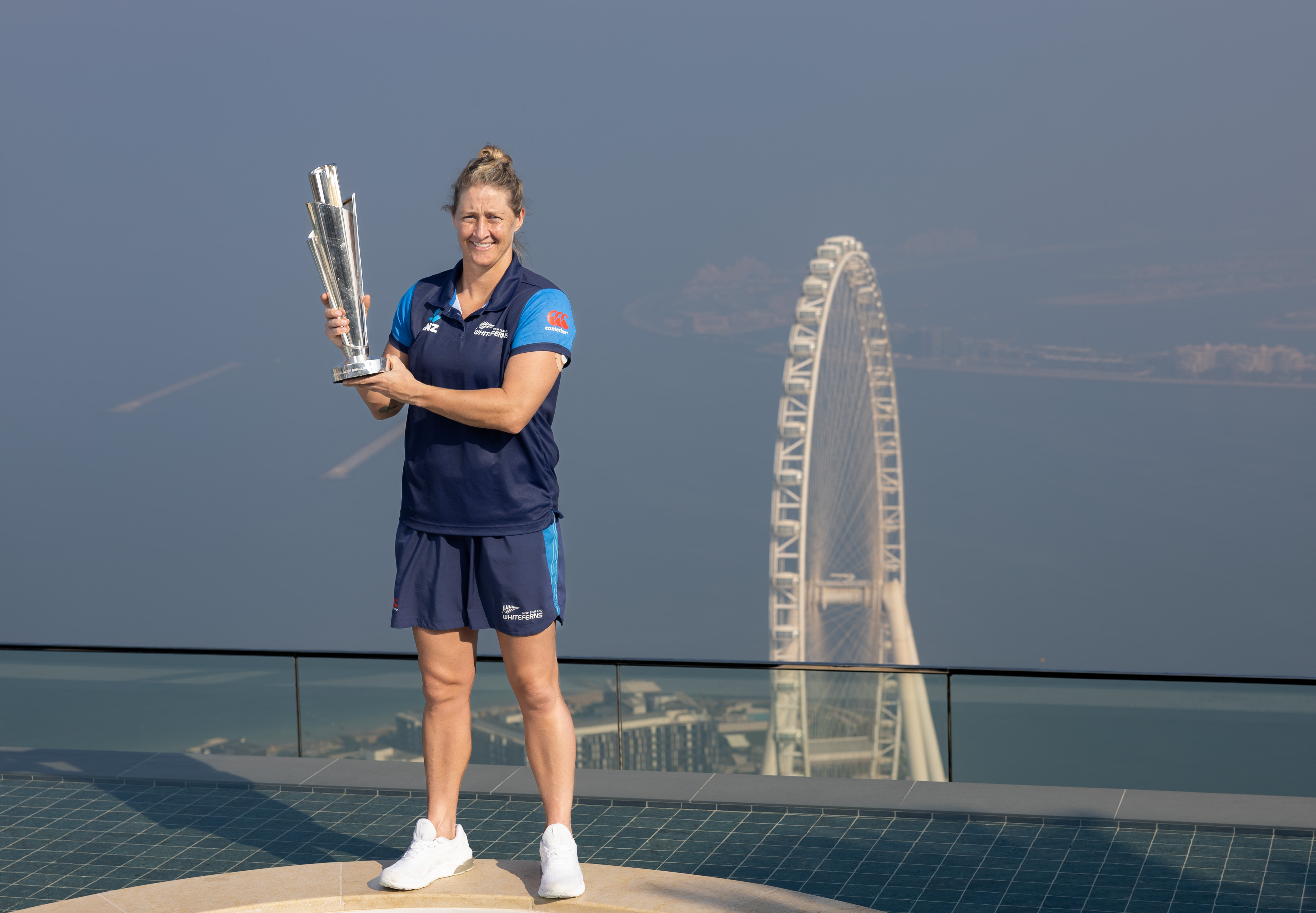 New Zealand captain Sophie Devine, ICC Women’s T20 World Cup 2024 champion, celebrates with the trophy at Dubai’s record-breaking infinity pool at The Address Beach Resort